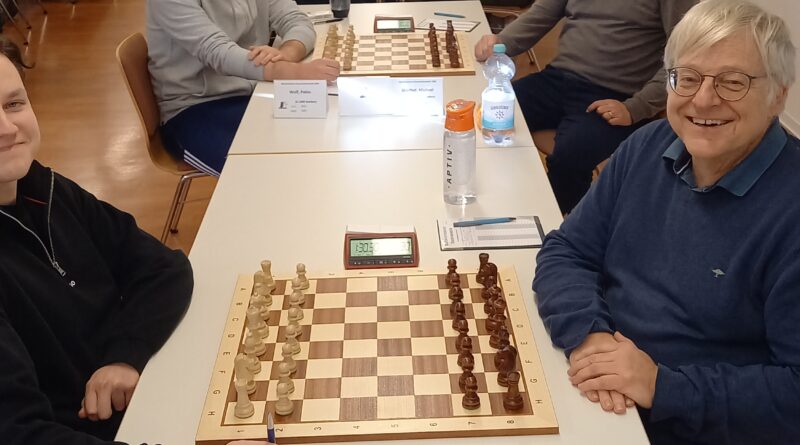 Kehren die alten Zeiten wieder? An den ersten zwei Brettern ist alles fest in Bamberger Hand. Unser Bild zeigt die vier erfolgreichen Spieler aus Bamberg, welche allesamt bisher ein perfektes Turnier spielen. Dumm nur, dass es durch die direkte Paarung nur zwei Punkte für die vier Spieler zu verteilen gibt. Den Beginn machen Torsten Müller und Hartleb mit der Punkteteilung an Brett 3 – nicht ...